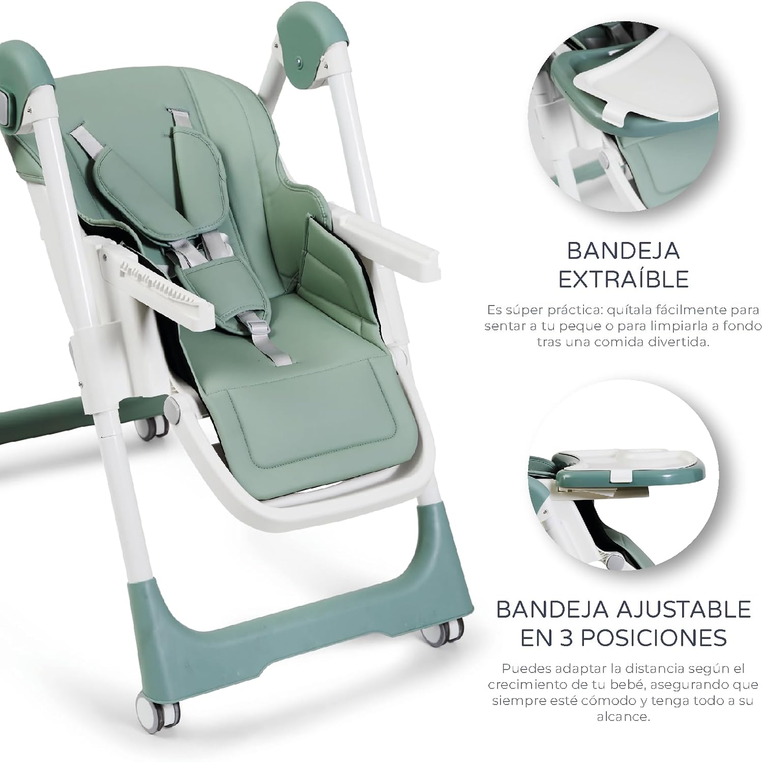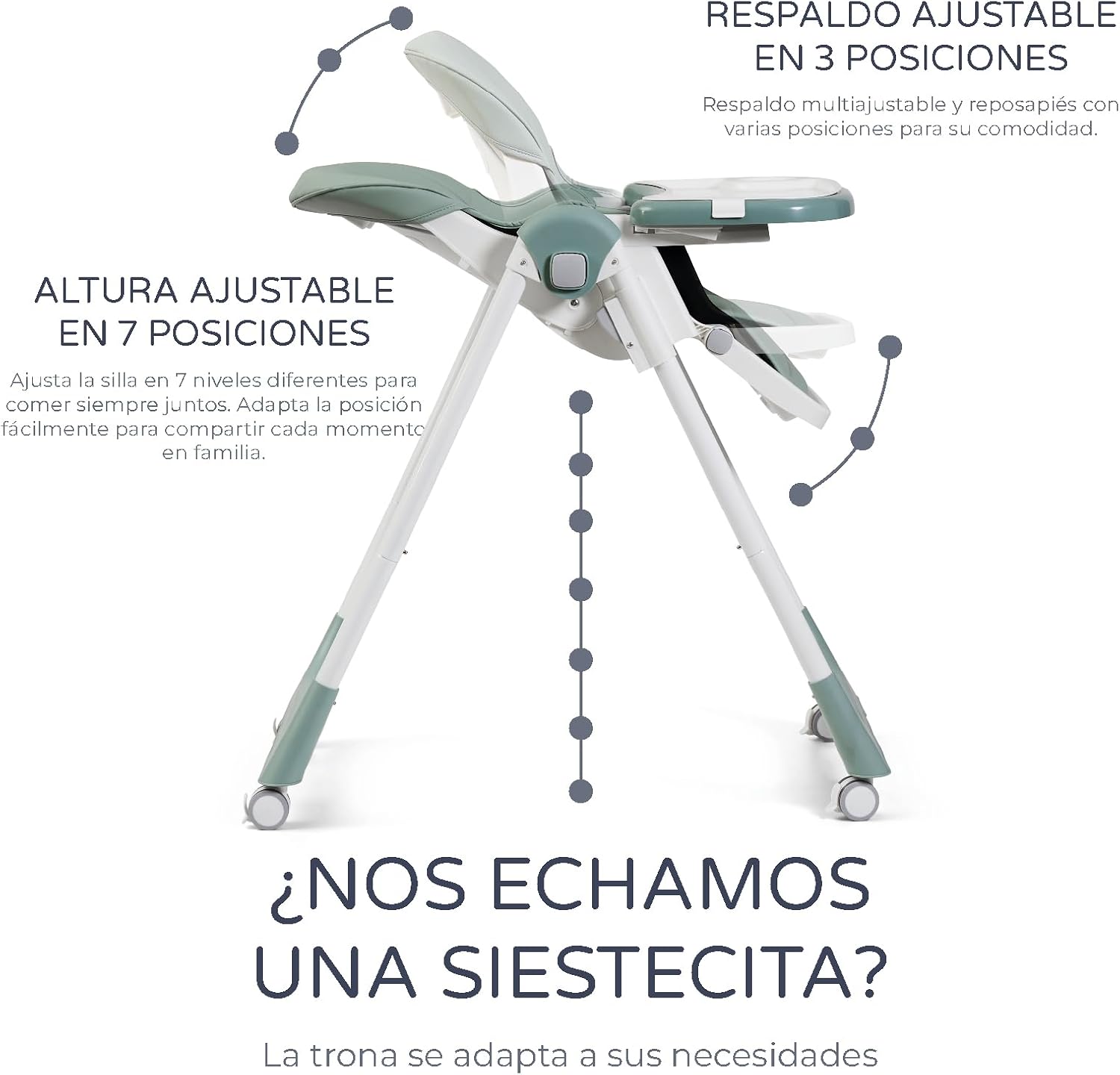 • Dispone di 6 posizioni di regolazione dell'altezza. Dalla posizione amaca alla posizione più alta per i pasti.